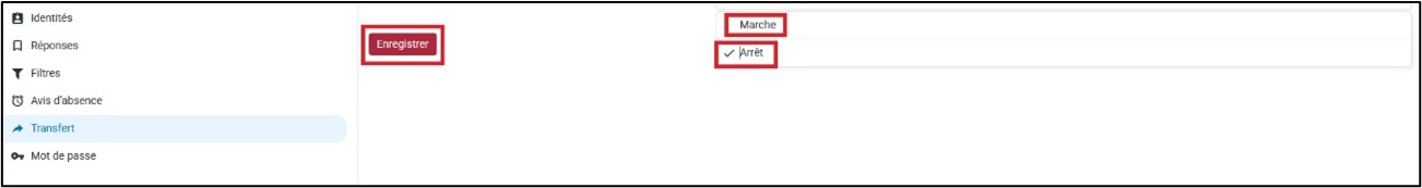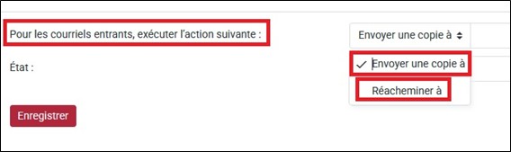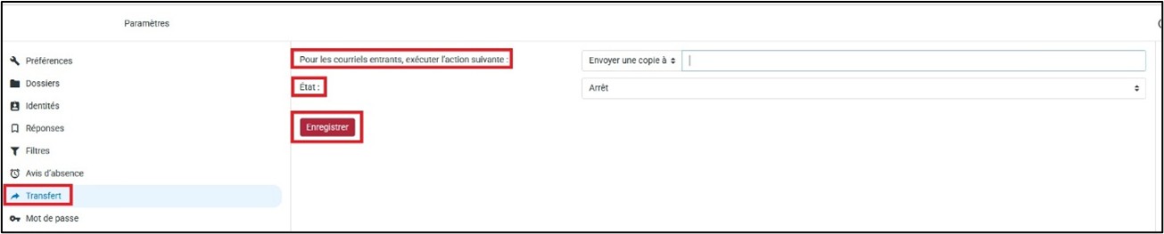 3 – Cliquez sur « Transfert » ici vous pouvez choisir deux actions : « Pour les courriels entrants, exécuter l’action suivante » et « L’État ».
