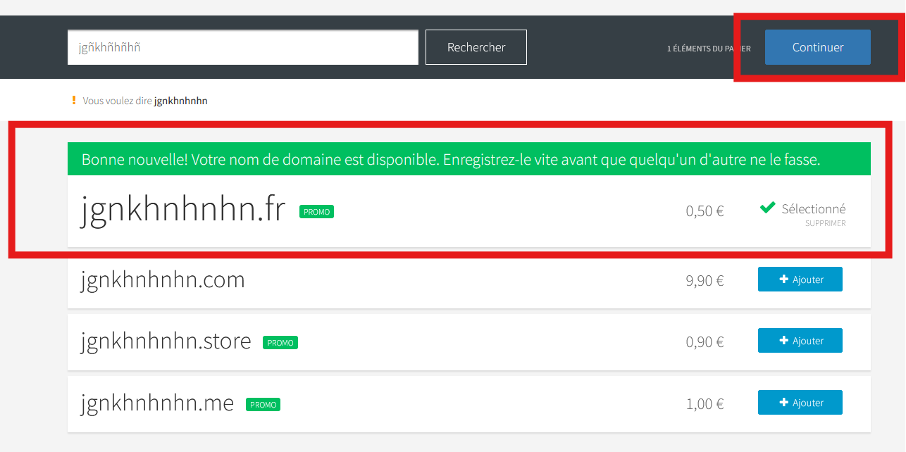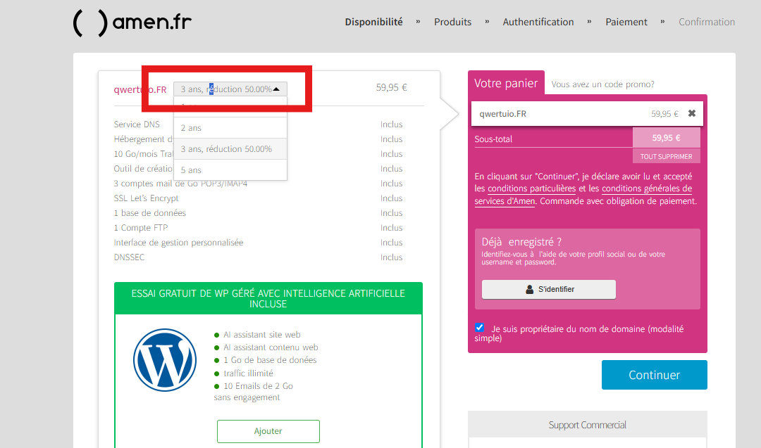 2- Une fois que vous avez sélectionner votre domaine, vous arrivez sur votre panier :