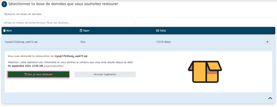 Restaurer une base de données (4) : Cette option permet de restaurer une base de données spécifique dans votre compte. Elle est particulièrement utile si vous rencontrez des problèmes de base de données et avez besoin de restaurer une version antérieure pour résoudre des erreurs ou des incohérences.