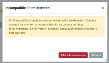 | Filtres existants dans la version webmail Classique | À la première ouverture des paramètres globaux, une fenêtre propose d’importer les filtres. En acceptant, les filtres sont convertis en syntaxe standard et désactivés du côté Classique pour éviter les conflits. | Cliquez sur Importer → les filtres apparaissent sous le nom « version webmail Beta ». |