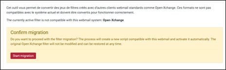 Le Filter Importer traduit les règles de filtrage créées dans la version webmail Classique (syntax OpenXchange) afin qu’elles soient utilisables dans la version webmail Beta (syntax Roundcube).