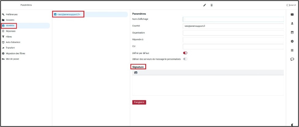3 – Cliquez sur « Identités », cliquez sur votre adresse électronique et vous pourrez y ajouter le texte de la signature.