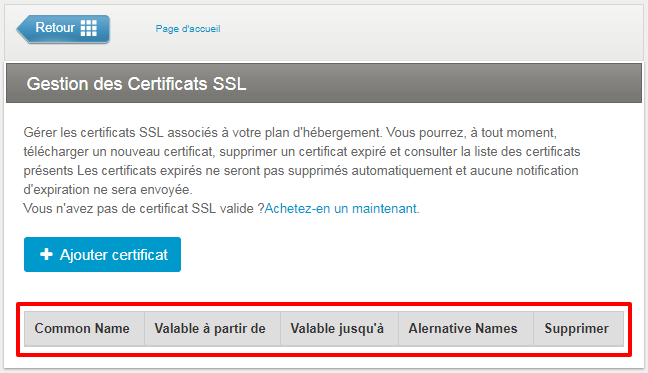 Pour lancer le processus d’émission du certificat SSL, accédez à votre Zone Client d’Amen et cliquez sur la colonne de droite au-dessus du certificat, sous la section "À ACTIVER" :