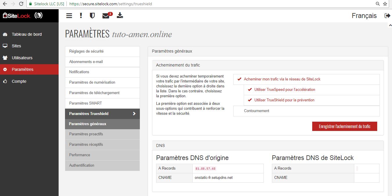 Pour finaliser la configuration de TrueShield, vous devrez modifier dans la zone DNS du nom de domaine les 3 enregistrements indiqués par SiteLock. Ainsi, tout le trafic de votre site sera filtré par SiteLock à travers le HTTPS.