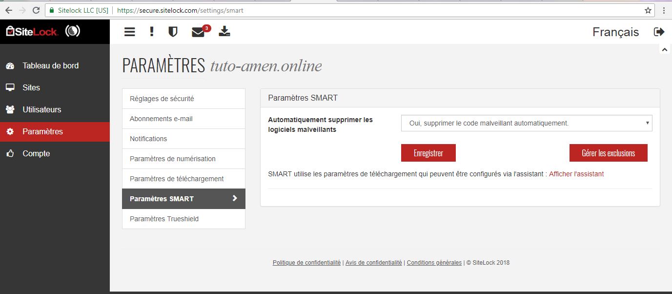 6 / Dans les Paramètres SMART, vous pourrez décider si SiteLock supprime automatiquement le code malveillant ou décider de recevoir une notification pour que vous puissiez vérifier vous-même les fichiers infectés. Cliquez ensuite sur Enregistrer.